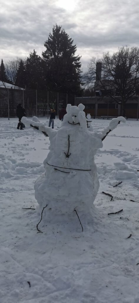 Die Schüler*innen der Klasse M7 gestalten im Kunstunterricht in Teamarbeit fantasievolle Schneefiguren. Erlaubt war alles, was mit Schnee und natürlichen Materialien möglich ist. (rb)